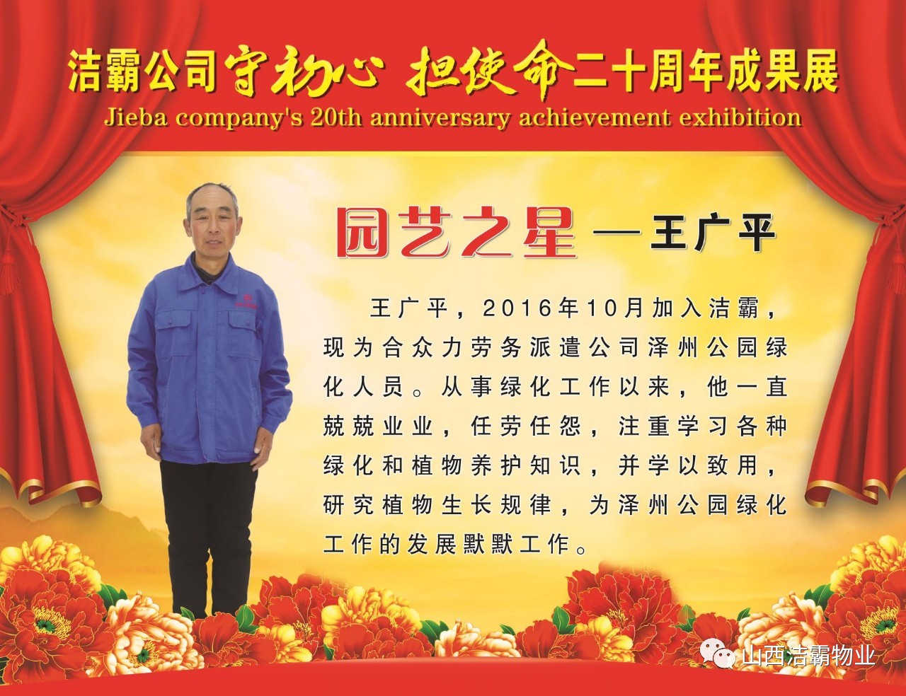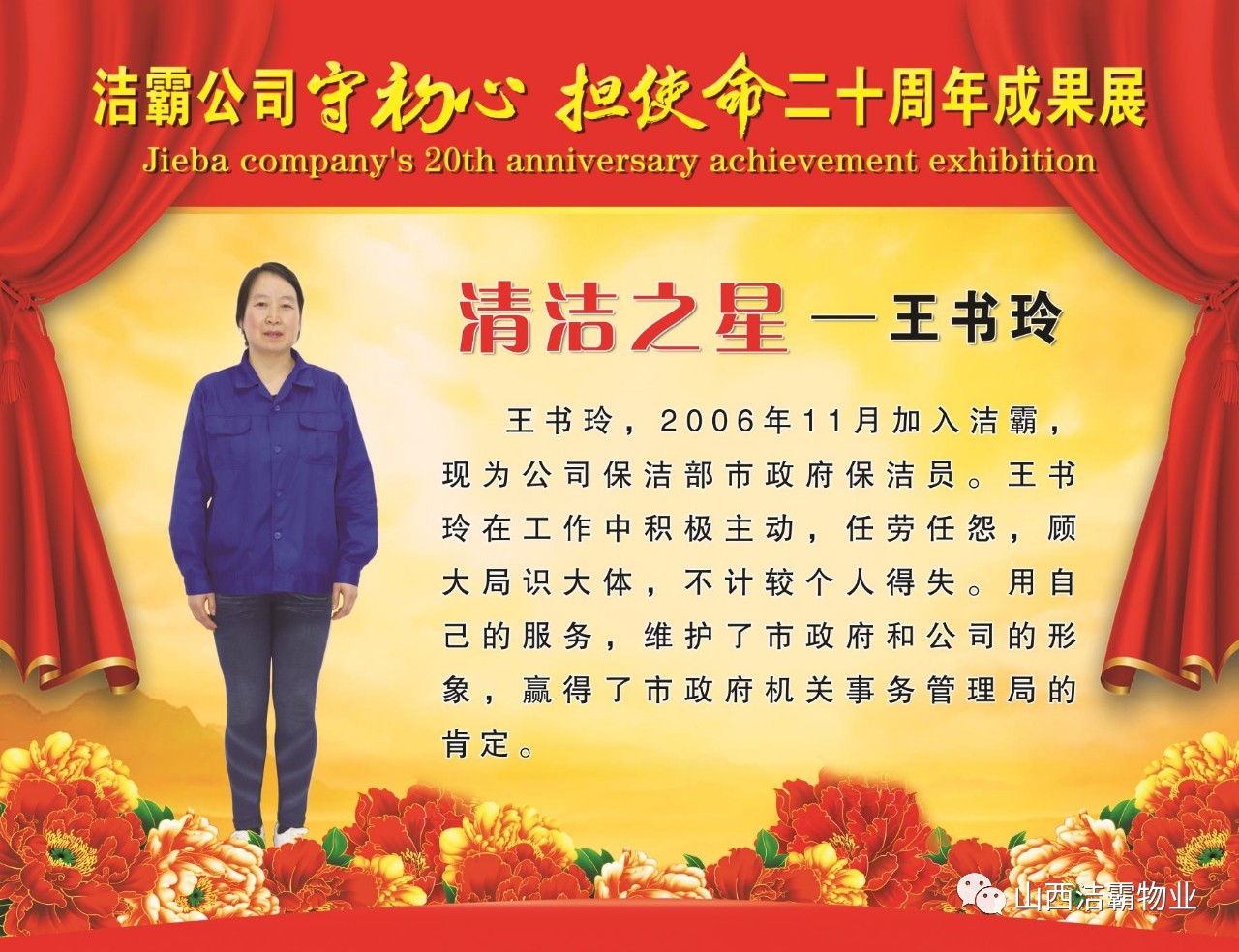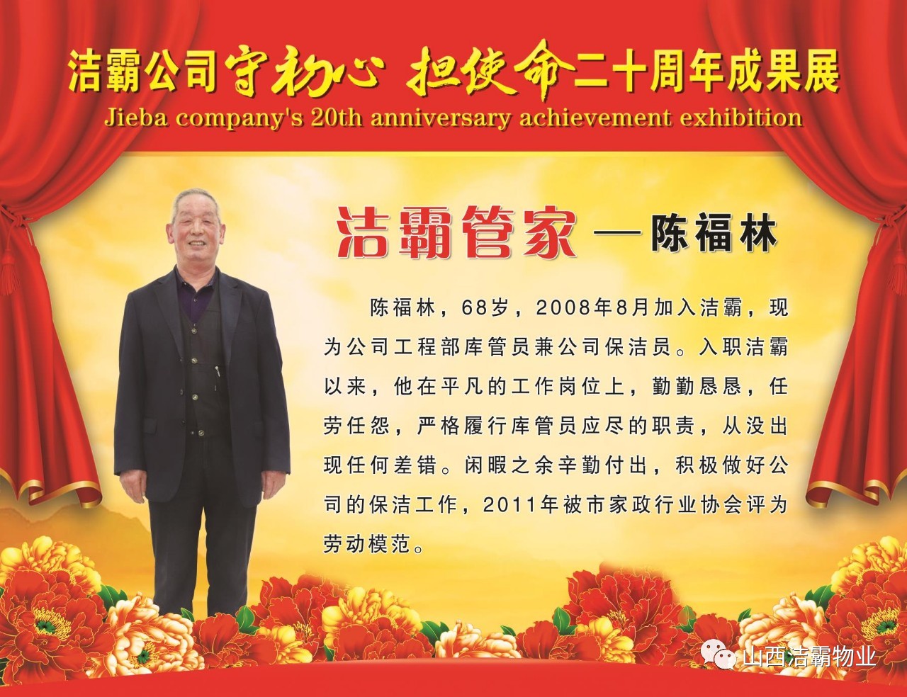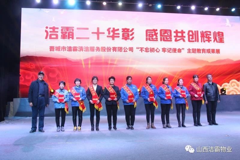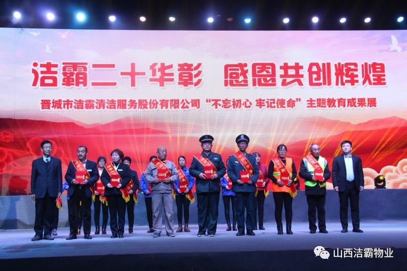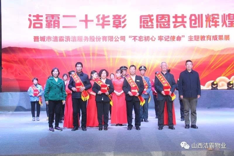 本次晚會以“潔霸二十華彰,感恩共創(chuàng)輝煌”為主題,此次慶典的核心思想是“感恩”,主要角色是潔霸的創(chuàng)業(yè)者。為此,公司對入職潔霸的創(chuàng)業(yè)功勛和一線員工進行了表彰獎勵。本次晚會共設(shè)8個獎項,包括“潔霸先鋒”“奉獻之星”“管理之星”“潔霸管家”“潔霸工匠”“清潔之星”“潔霸衛(wèi)士”“園藝之星”等。他們是:李山虎、張永智、史志霞、陳福林、王紅軍、余艷青、劉二丑、成艷粉、楊改梅、王書玲、張國榮、耿竹青、張粉霞、宋秋苗、陳先梅、張晉平、張偉山、趙瑞軍、王廣平、郭志云。晉城市原副市長成育廷、晉城市商務(wù)局原局長王新善、晉城市非公和社會組織工委書記郎軍芳、晉城市婦聯(lián)三級調(diào)研員李蓮菊、晉城市總工會商貿(mào)輕紡煙草服務(wù)業(yè)工會主席張玉濤、晉城市城區(qū)財政局局長翟明太等領(lǐng)導為他們頒獎。