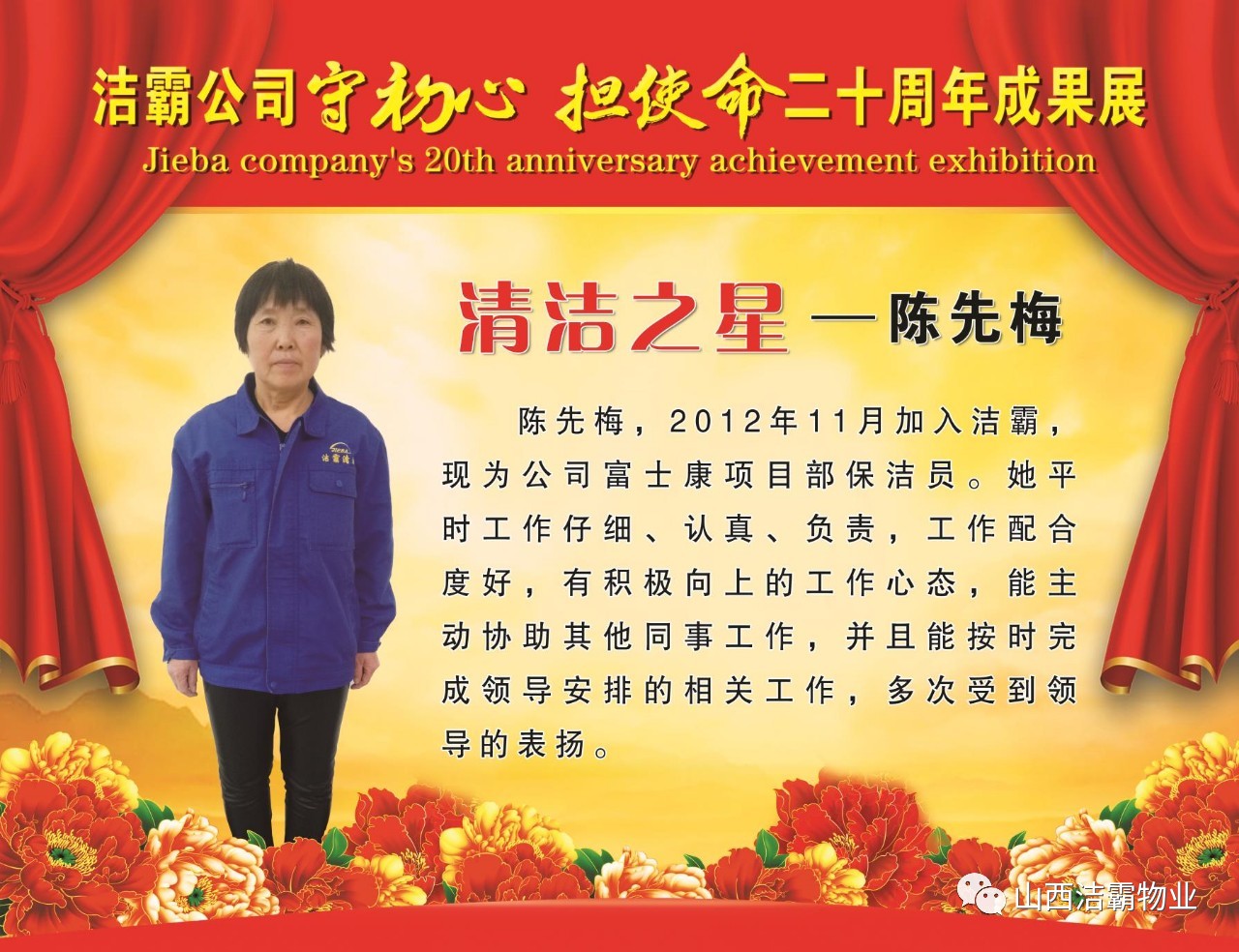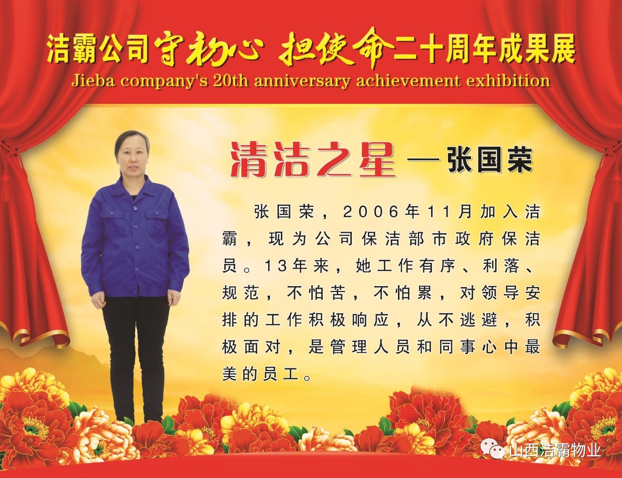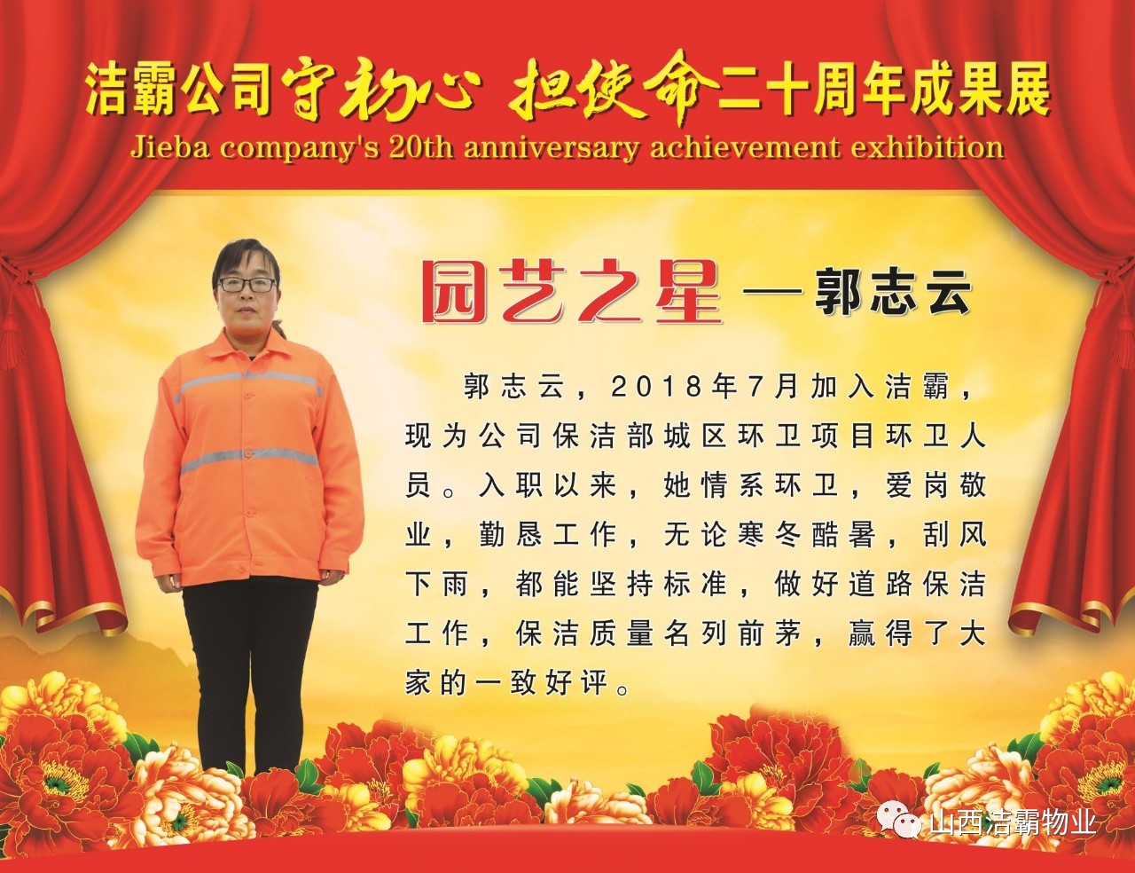 本次晚會以“潔霸二十華彰,感恩共創(chuàng)輝煌”為主題,此次慶典的核心思想是“感恩”,主要角色是潔霸的創(chuàng)業(yè)者。為此,公司對入職潔霸的創(chuàng)業(yè)功勛和一線員工進行了表彰獎勵。本次晚會共設(shè)8個獎項,包括“潔霸先鋒”“奉獻之星”“管理之星”“潔霸管家”“潔霸工匠”“清潔之星”“潔霸衛(wèi)士”“園藝之星”等。他們是:李山虎、張永智、史志霞、陳福林、王紅軍、余艷青、劉二丑、成艷粉、楊改梅、王書玲、張國榮、耿竹青、張粉霞、宋秋苗、陳先梅、張晉平、張偉山、趙瑞軍、王廣平、郭志云。晉城市原副市長成育廷、晉城市商務(wù)局原局長王新善、晉城市非公和社會組織工委書記郎軍芳、晉城市婦聯(lián)三級調(diào)研員李蓮菊、晉城市總工會商貿(mào)輕紡煙草服務(wù)業(yè)工會主席張玉濤、晉城市城區(qū)財政局局長翟明太等領(lǐng)導為他們頒獎。