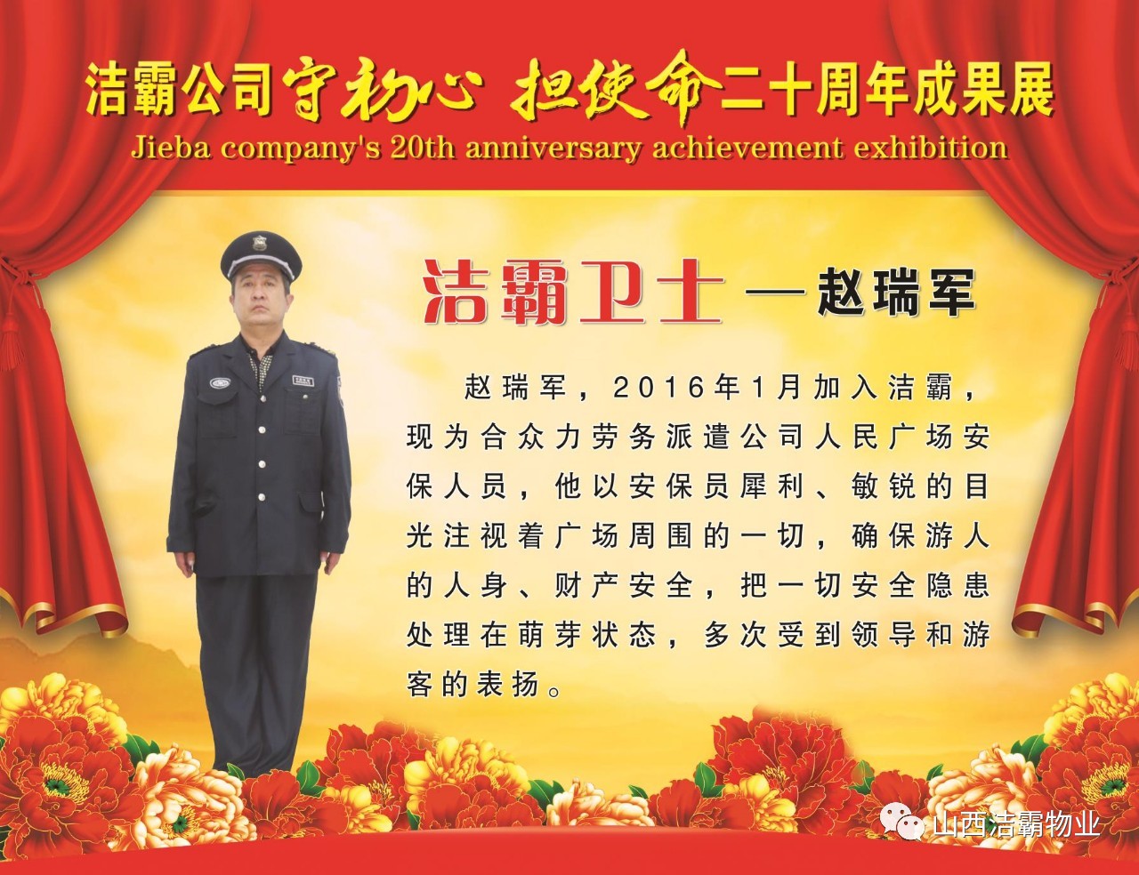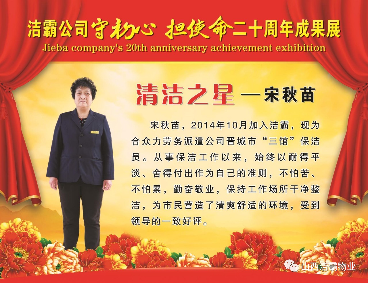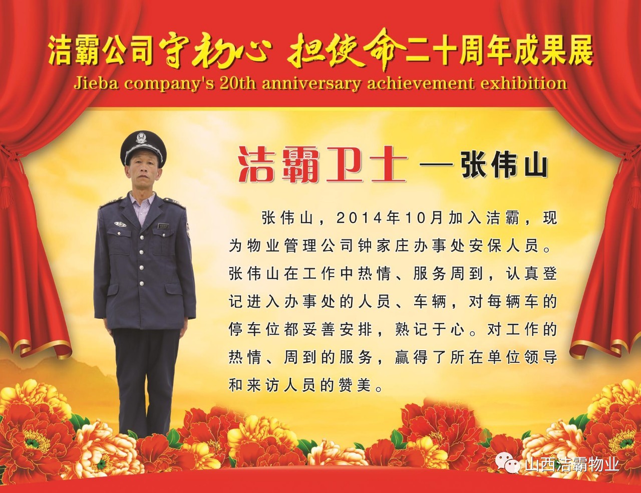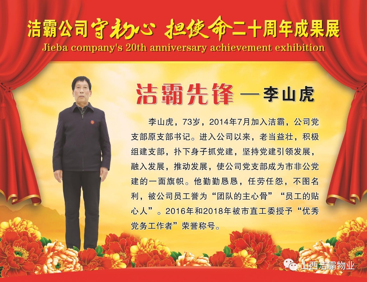 本次晚會以“潔霸二十華彰,感恩共創(chuàng)輝煌”為主題,此次慶典的核心思想是“感恩”,主要角色是潔霸的創(chuàng)業(yè)者。為此,公司對入職潔霸的創(chuàng)業(yè)功勛和一線員工進行了表彰獎勵。本次晚會共設(shè)8個獎項,包括“潔霸先鋒”“奉獻之星”“管理之星”“潔霸管家”“潔霸工匠”“清潔之星”“潔霸衛(wèi)士”“園藝之星”等。他們是:李山虎、張永智、史志霞、陳福林、王紅軍、余艷青、劉二丑、成艷粉、楊改梅、王書玲、張國榮、耿竹青、張粉霞、宋秋苗、陳先梅、張晉平、張偉山、趙瑞軍、王廣平、郭志云。晉城市原副市長成育廷、晉城市商務(wù)局原局長王新善、晉城市非公和社會組織工委書記郎軍芳、晉城市婦聯(lián)三級調(diào)研員李蓮菊、晉城市總工會商貿(mào)輕紡煙草服務(wù)業(yè)工會主席張玉濤、晉城市城區(qū)財政局局長翟明太等領(lǐng)導為他們頒獎。