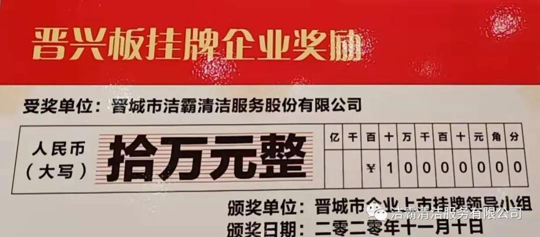 晉城市潔霸清潔服務(wù)股份有限公司于2019年11月27日成功登陸山西股權(quán)交易中心“專精特新板”(晉興板)(企業(yè)代碼:060200Z),是“專精特新板”開板暨首批掛牌的14家企業(yè)之一!皩>匦掳濉笔巧轿鞴蓹(quán)交易中心設(shè)立的特色板塊,為省內(nèi)具備專業(yè)化、精細(xì)化、特色化、新穎化的優(yōu)質(zhì)企業(yè)提供專屬服務(wù),成為帶動(dòng)全省中小企業(yè)創(chuàng)新創(chuàng)造、轉(zhuǎn)型升級(jí),壯大工業(yè)高質(zhì)量發(fā)展的生力軍!皶x興板”掛牌,標(biāo)志著公司正式進(jìn)軍資本市場,豐富了融資渠道,推動(dòng)公司高質(zhì)量轉(zhuǎn)型發(fā)展,成為公司發(fā)展的新引擎。