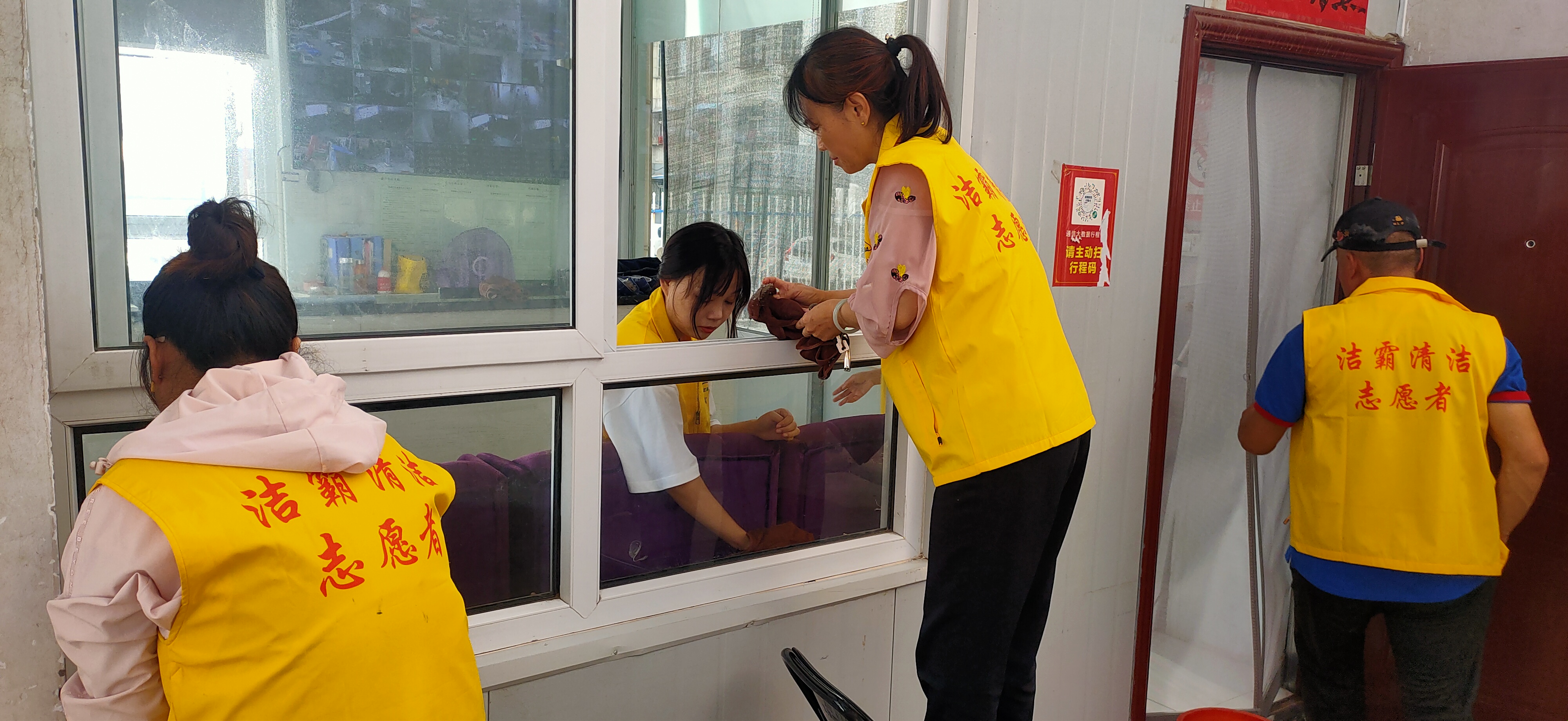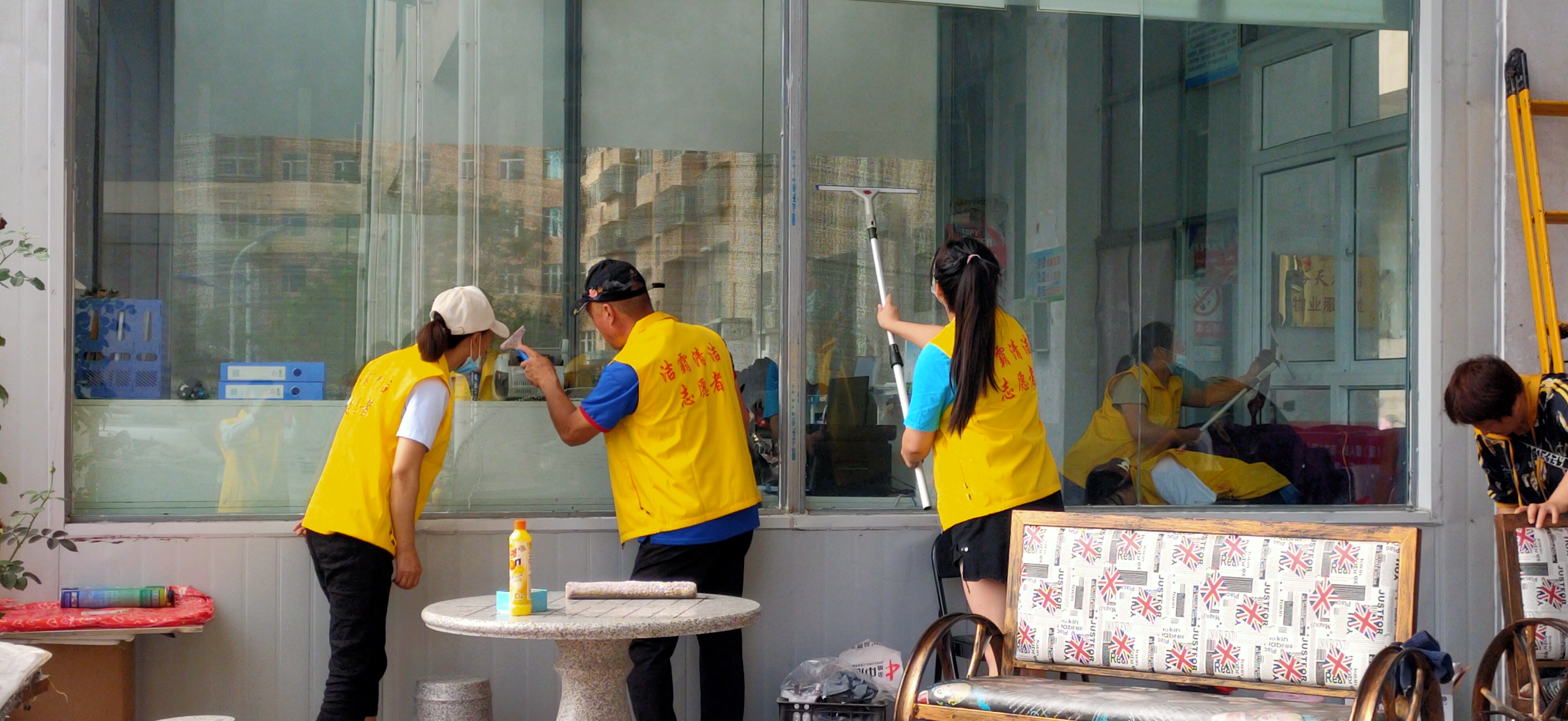活動現(xiàn)場,志愿者身穿黃色馬甲,自帶玻璃擦、毛巾、笤帚、簸箕等清潔工具,對小區(qū)物業(yè)服務(wù)處及小區(qū)環(huán)境進(jìn)行清潔打掃。他們有的清掃小區(qū)天臺上的垃圾;有的清理樓道門及公共設(shè)施上的牛皮癬;有的擦拭門衛(wèi)的玻璃;有的清洗紗窗;有的清洗物業(yè)服務(wù)處的玻璃幕墻……志愿者個個干勁十足,不怕臟、不怕累,經(jīng)過一個多小時的團(tuán)結(jié)協(xié)作,小區(qū)環(huán)境煥然一新。
