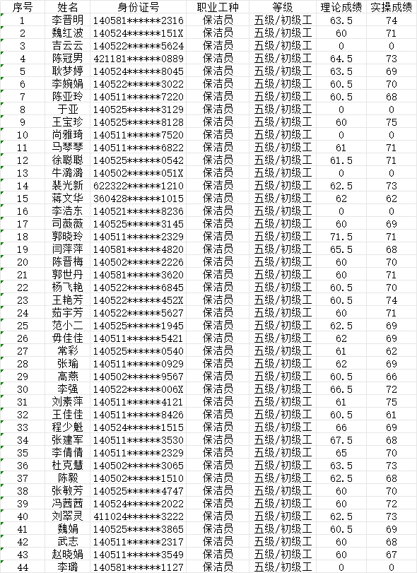 晉城市潔霸清潔服務(wù)股份有限公司職業(yè)技能等級(jí)認(rèn)定中心2024年7月21日第23批保潔員初級(jí)認(rèn)定人員成績(jī)公示
