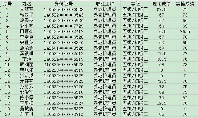20241014日第42批養(yǎng)老護(hù)理員初級(jí)認(rèn)定人員成績(jī)公示
